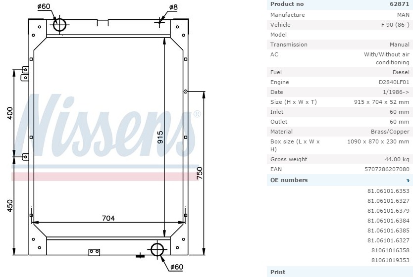 Радиатор системы охлаждения MAN F90 915x704x47