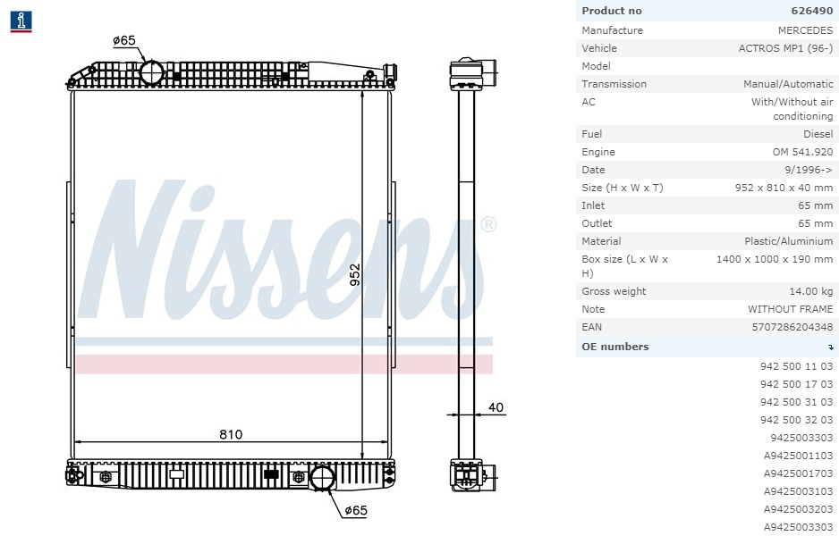 Радиатор системы охлаждения MERCEDES Actros 808x952x42...