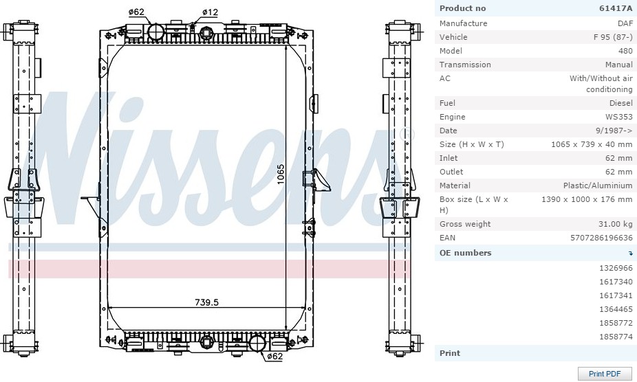 Радиатор системы охлаждения DAF 95XF 1065x768x42 с рамк...