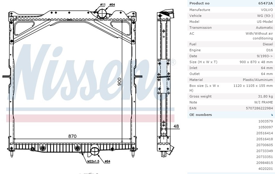 Радиатор системы охлаждения VOLVO FH12/16 900x870x48 бе...