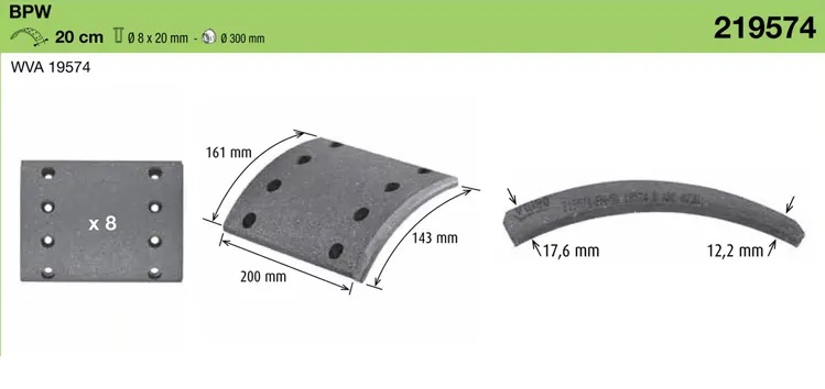 Накладки тормозные BPW.Cardi.Kass 300x200 18.0-11.0 (93251 8x15 64) 2REM